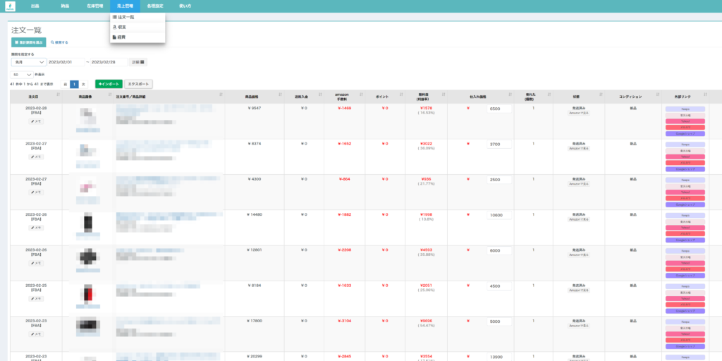 PATDELでは、Amazonやメルカリで売れた商品を管理したり、経費を入力し自動で収集表を作成することができます。注文一覧こちらではAmazonで注文された商品の一覧を確認することができます。">