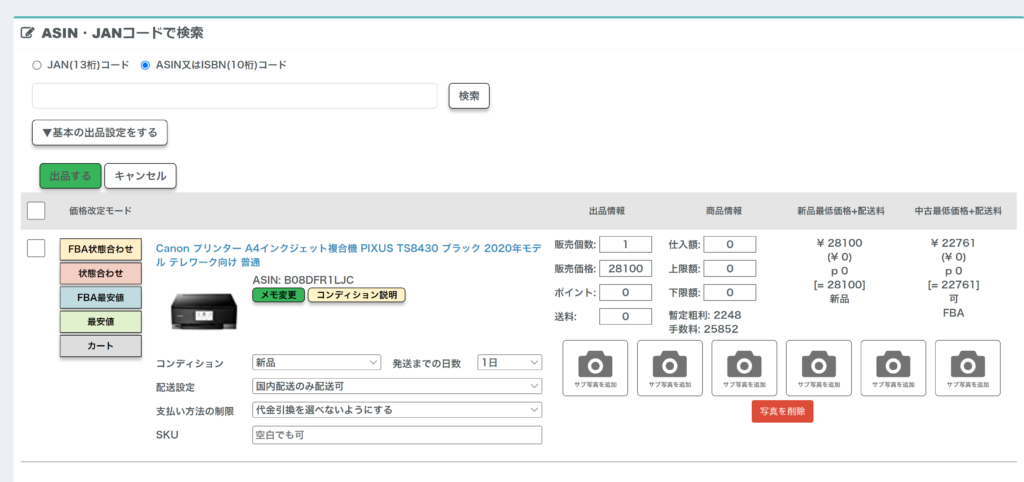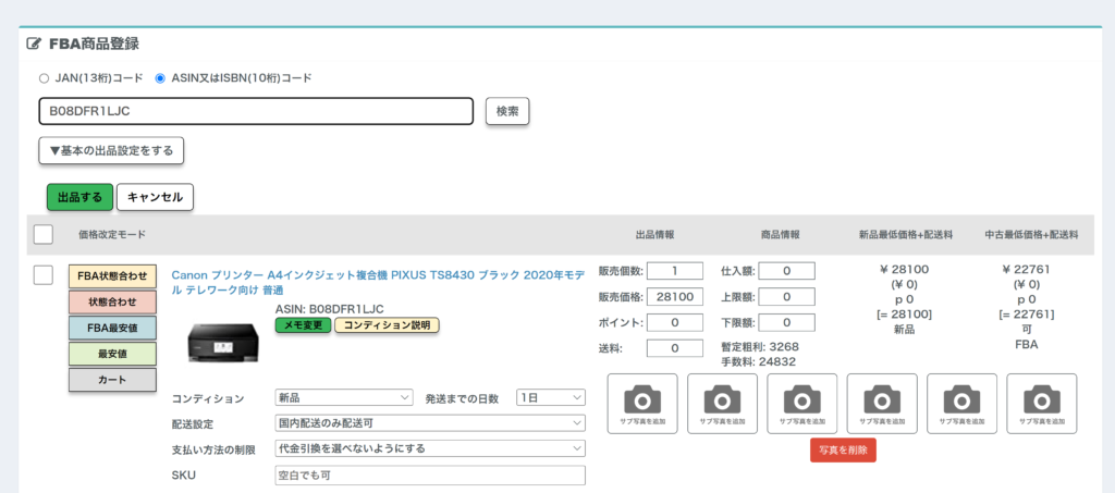 こちらではAmazonへの商品登録・出品を行うことができます。Amazonは、商品が売れた後に自分の事務所や自宅から配送を行う「自己配送」。">
