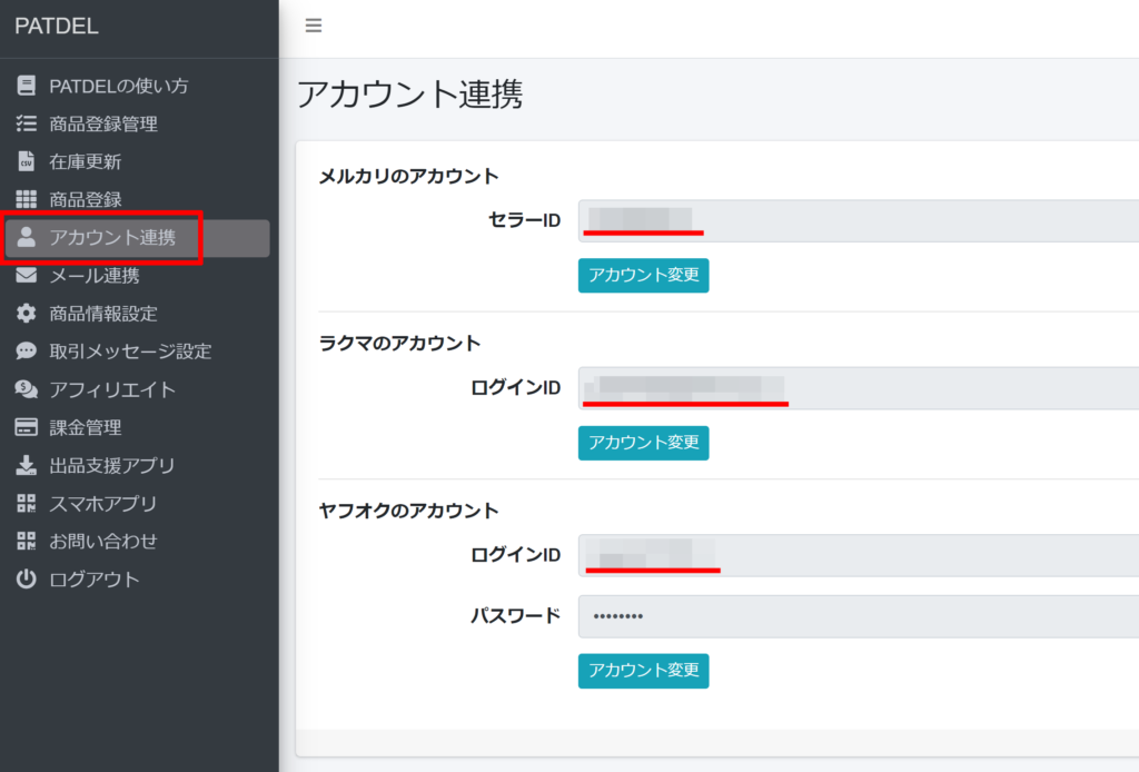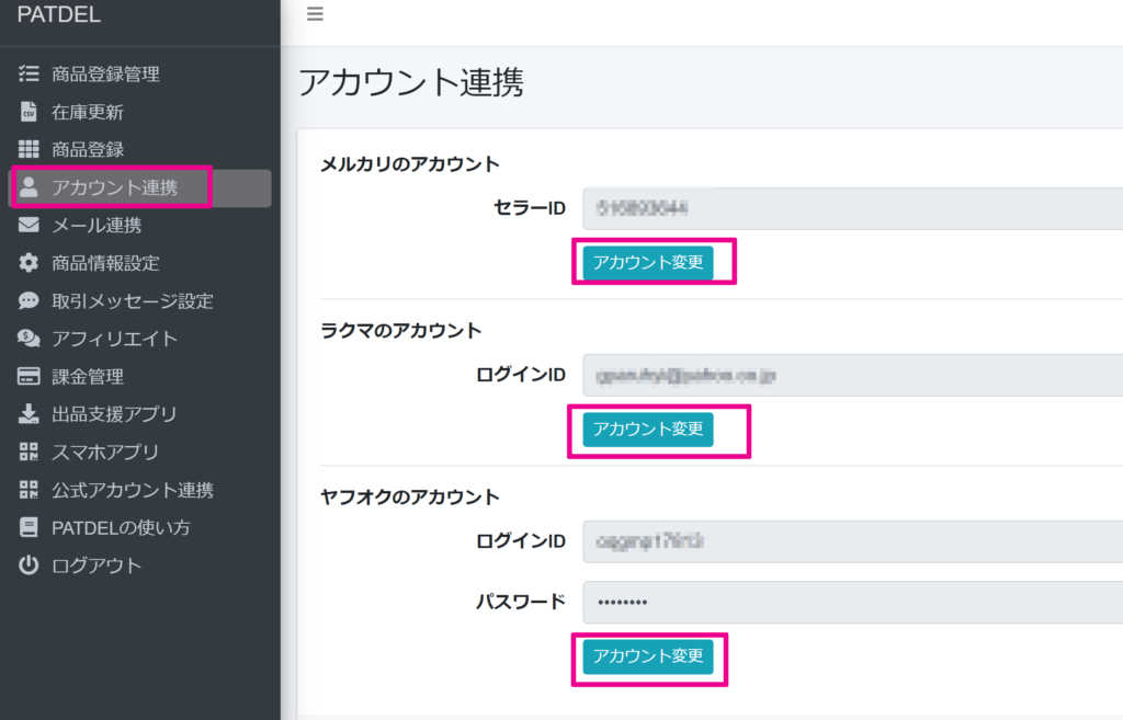 Q1. メルカリ・ヤフオク・ラクマのアカウントを入れ替えたいまずWEBアプリにログインをしていただき、「アカウント連携」をクリック。次に変更したいアカウントの「アカウント変更」をクリック。">